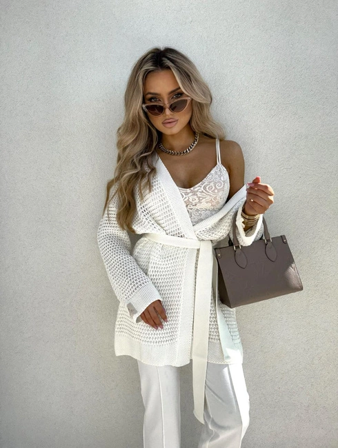 - Kardigan Melli – biały, klasyczny kardigan o uniwersalnym kroju. Doskonały na co dzień i na chłodniejsze dni. Z naszywką z logo na rękawie.
