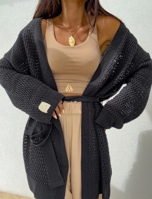 - Kardigan Melli – czarny, klasyczny kardigan o uniwersalnym kroju. Doskonały na co dzień i na chłodniejsze dni. Z naszywką z logo na rękawie.