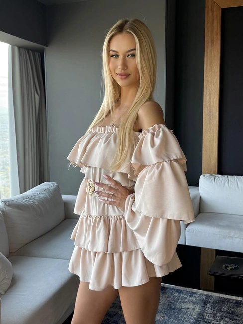 Kombinezon SUZAN to wyjątkowy model, który łączy elegancję z wygodą. Charakterystyczna góra z dekoltem typu hiszpanka pięknie eksponuje ramiona, a szerokie rękawy nadają stylizacji lekkości i romantycznego charakteru. Wykonany z delikatnej, zwiewnej tkaniny, idealnie sprawdzi się w cieplejsze dni. Dodatkowy pasek w talii pozwala dopasować kombinezon do sylwetki i subtelnie ją podkreślić. To świetna propozycja na wiosenne i letnie stylizacje – zarówno na co dzień, jak i na wyjątkowe okazje.