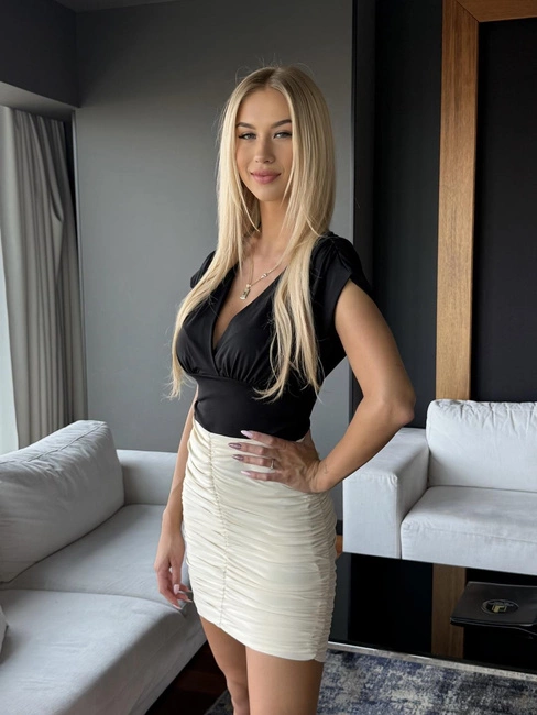 - Spódnica Marszczona Kira – beżowa, wykonana z podwójnego, elastycznego materiału, który uwydatnia dolne partie sylwetki. Doskonała na różne okazje.